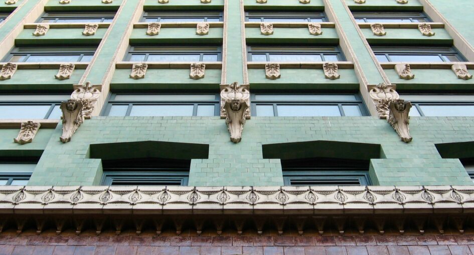 Dotted all around this green terra cotta façade are male figures that could be either friend or foe. Are they benevolently guarding the building, like sentries, or are they menacing, like gargoyles? His expression is calm, but to me the devilish beard and the chopping-block pose look like a warning to other would-be criminals. Now called the Pacific Building, it was built in 1907 as the Pacific Union Building and designed by Charles Whittlesey. Whittlesey initially worked under Louis Sullivan in Chicago — I can see that influence.